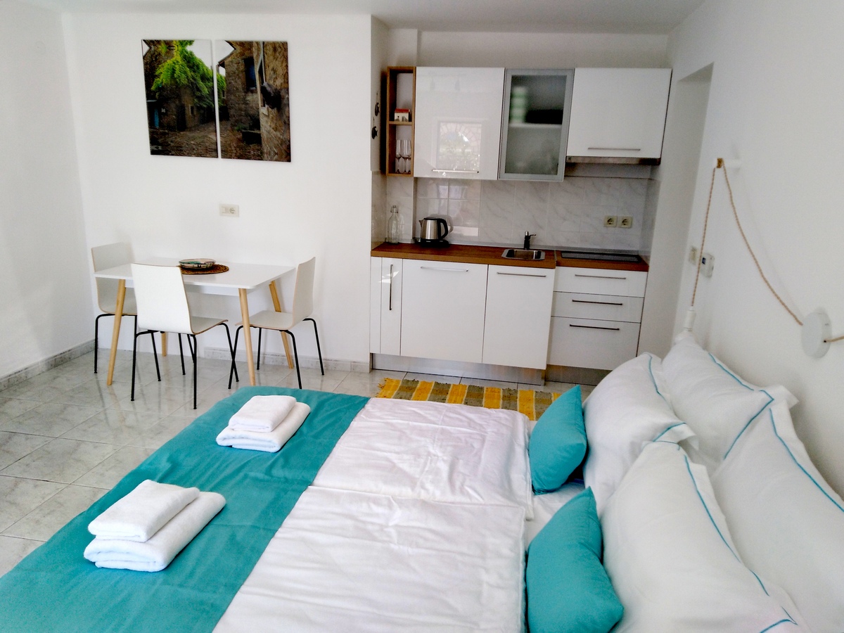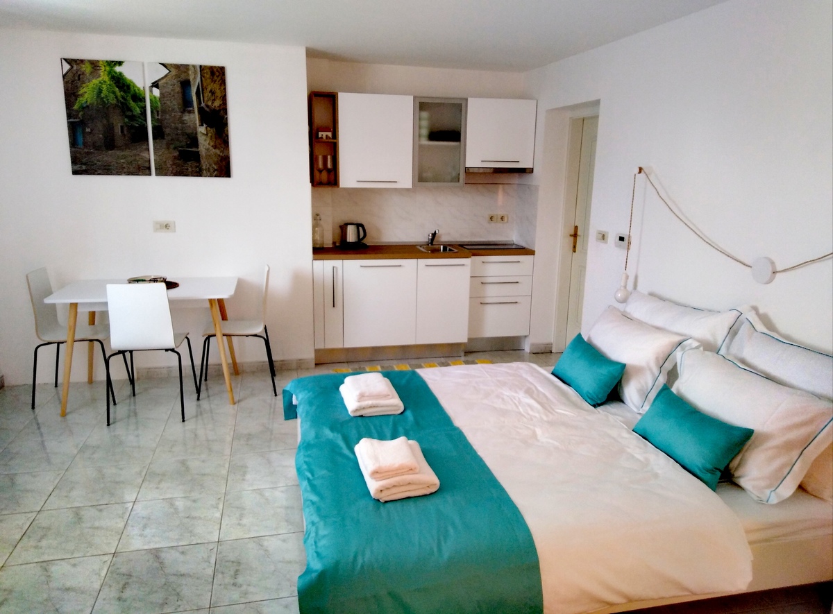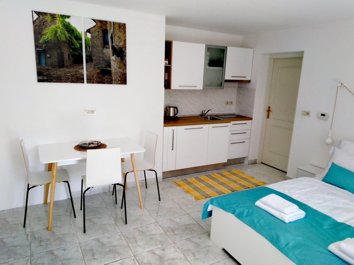 Apartment "Studio" is a spacious and airy 35 m2 studio apartment. The entrance is from the courtyard where you can park your car. The kitchen, with a fridge, a hob and a kettle, is brand new, as is all the other furniture in the apartment. There is a big bed (160 cm wide), a dining corner, a wardrobe and a TV. The bathroom has a shower and is very spacious.
