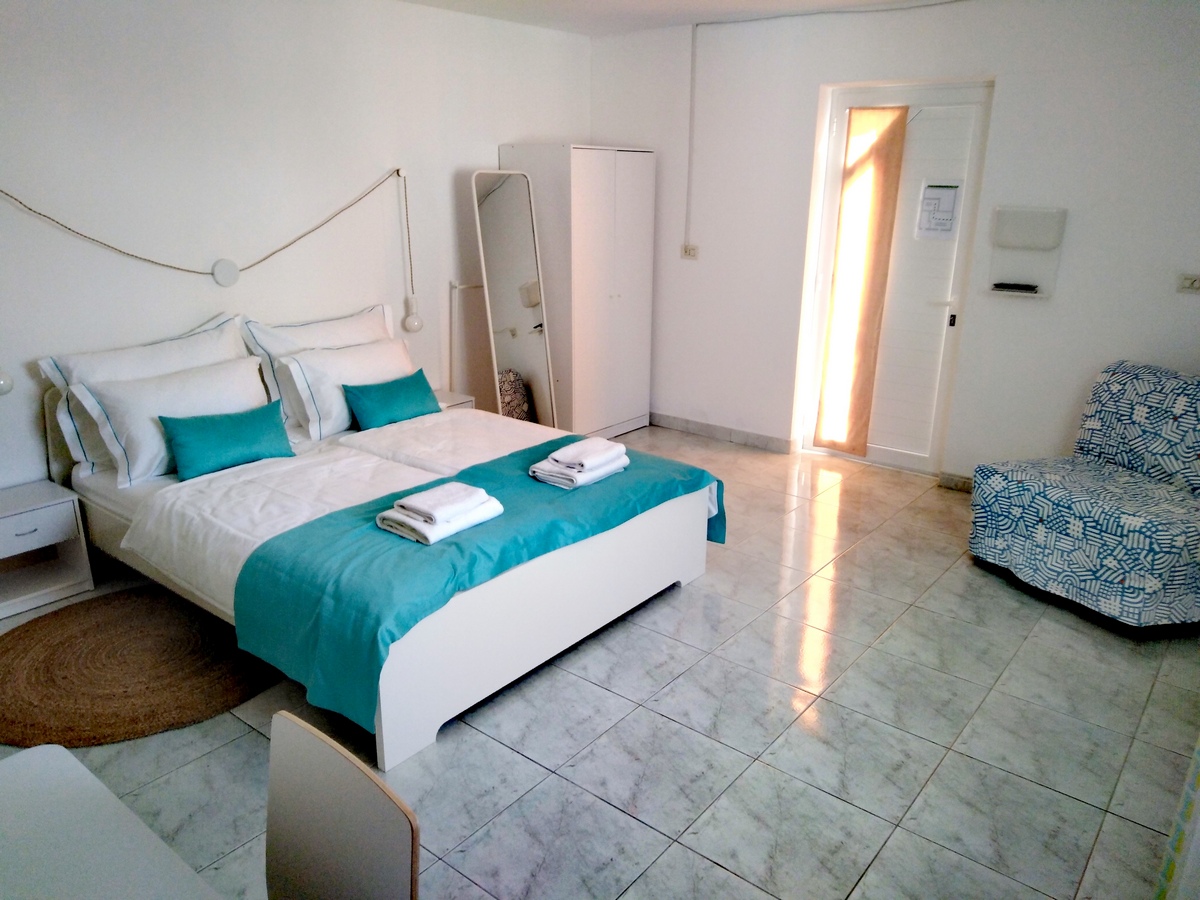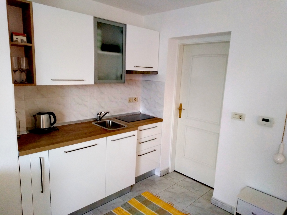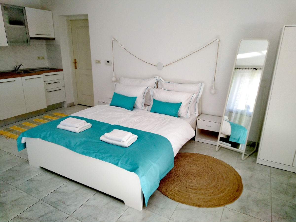 Apartment "Studio" is a spacious and airy 35 m2 studio apartment. The entrance is from the courtyard where you can park your car. The kitchen, with a fridge, a hob and a kettle, is brand new, as is all the other furniture in the apartment. There is a big bed (160 cm wide), a dining corner, a wardrobe and a TV. The bathroom has a shower and is very spacious.